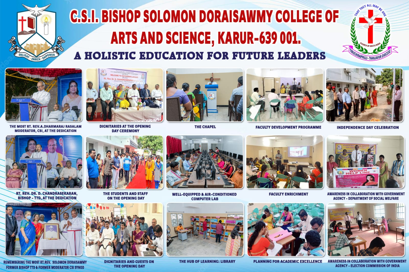 Bishop Solomon Doraisawmy was a multi-faceted personality who was known for his multi-tasking ability. Being a born educationalist with great foresight, he had a prime vision for growth through education. A great milestone during his tenure was reviving the Bishop Heber College after a long void of 34 years and to raise it to a Post-graduate College of the day with facilities second to none in the field. Bishop Solomon Doraisawmy gave utmost care to the quality of education and never spared to compromise with it. He enhanced the infrastructural requirements through his foresighted efforts. Several renovations, reconstructions and new establishments were erected to be the pillars of education. His policy has been to hasten to the help of the poor who need education so none of them is denied an opportunity for education for want of economic means. The educational policies of the Bishop have brought socio-economic and cultural liberation for the oppressed. The academic development Bishop Solomon Doraisawmy brought into the length and breadth of Trichy and its neighbourhood is tremendous. The empowering of the society through Professional and non-professional courses has enriched the lives of people and delivered from the bondage of ignorance and inferiority. Today, CSI Bishop Solomon Doraisawmy College of Arts and Science stands as a monument holding his dreams and vision.